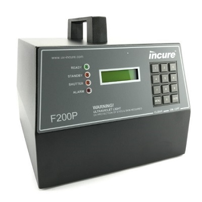 The F200P is a programmable UV flood curing lamp. Incure F200P integrates all system components into a small lamp head which can be easily mounted anywhere on a factory floor, with virtually no cabling or remote control boxes required. Just mount the head, connect the AC line cord, and start timed exposure curing! The system contains an integrated retractable shade type shutter, which allows for repeatable exposure timing, and shields the user from UV radiation. The system’s LCD display and digital keypad make programming and monitoring of curing operations a snap. The long life 600-Watt metal halide type lamp and parabolic reflector illuminate an 8 x 6 inch curing area with evenly distributed 200mW/cm2 UVA light (320–390nm). The arc lamp is powered by the state of the art UV Power-Plus Lamp Driver.